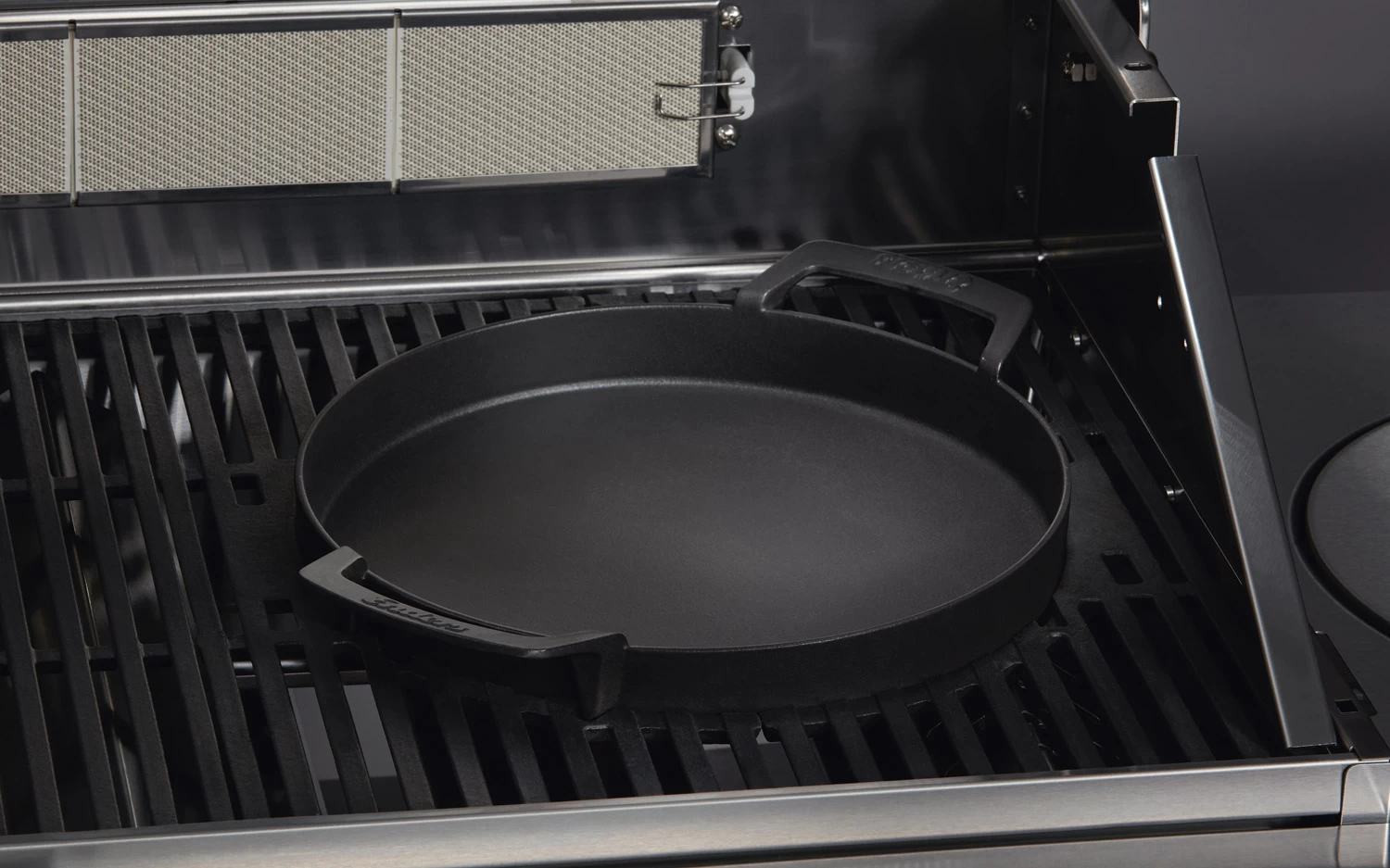 Der massive Pfannen-Einsatz aus emailliertem Gusseisen passt genau in die Aussparung des SWITCH GRID™ Grillrostsystems von Enders und lässt sich mit den beiden stabilen Griffen bequem einsetzen und auch wieder herausnehmen. Die exzellente Wärmeleitfähigkeit des Gusseisens sorgt für eine schnelle Erhitzung und einen gleichmäßige Hitzeverteilung in der Pfanne.