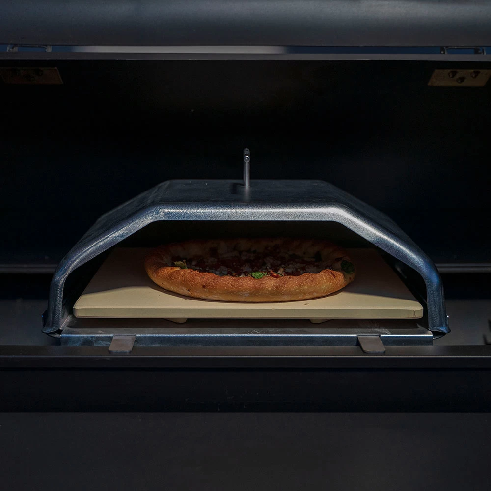 Verwandeln Sie den GMG Ledge oder Peak in einen holzbefeuerten Gourmet Pizzaofen und zaubern Sie in Windeseile leckere Pizza auf dem Pelletgrill.