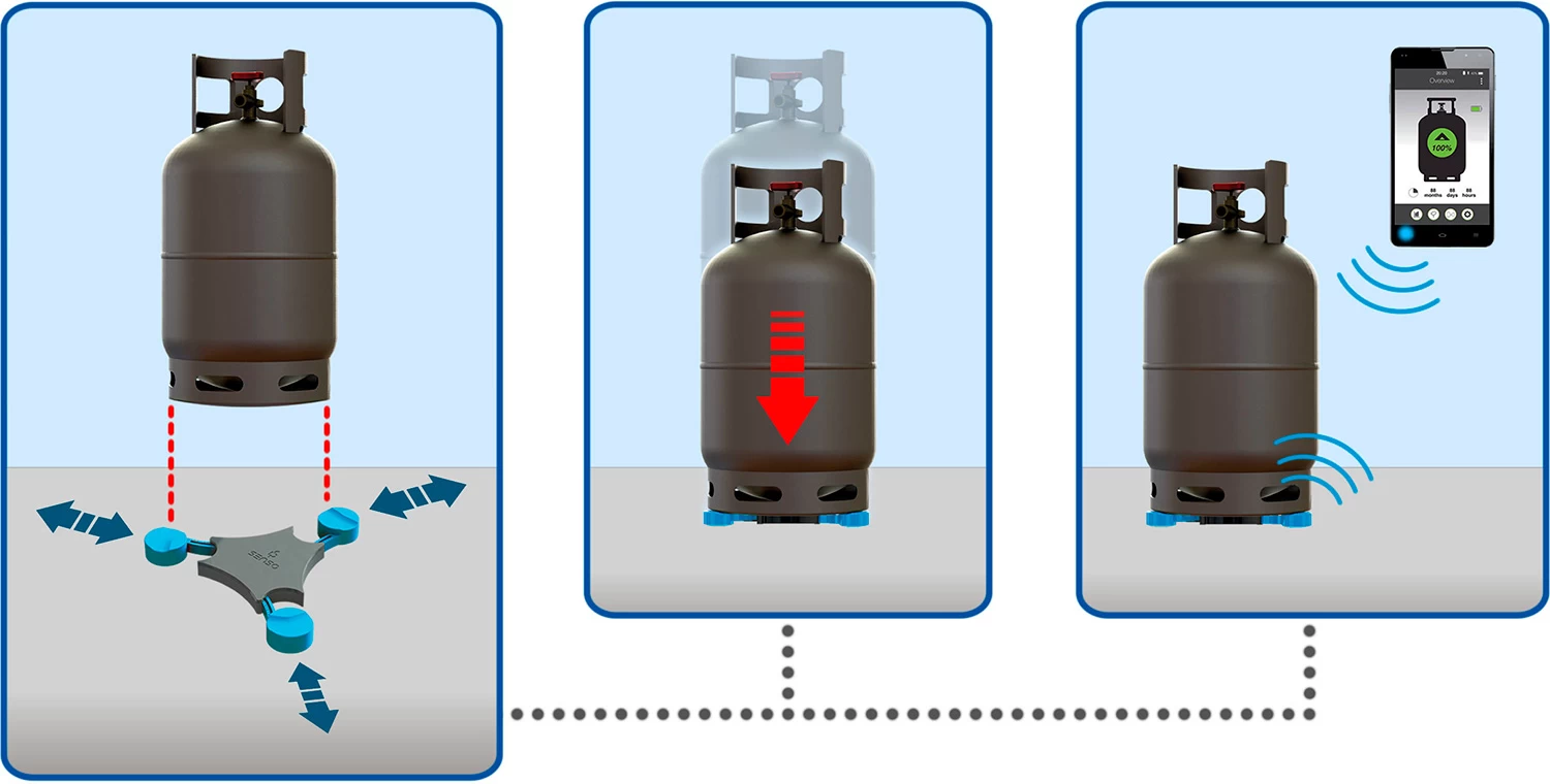 Das Senso4s System besteht aus einer größenverstellbaren Gasflaschenwaage (für verschiedene Gasflaschendurchmesser) und einer App fürs Smartphone (Android und iOS), das per Bluetooth mit der Waage gekoppelt wird.