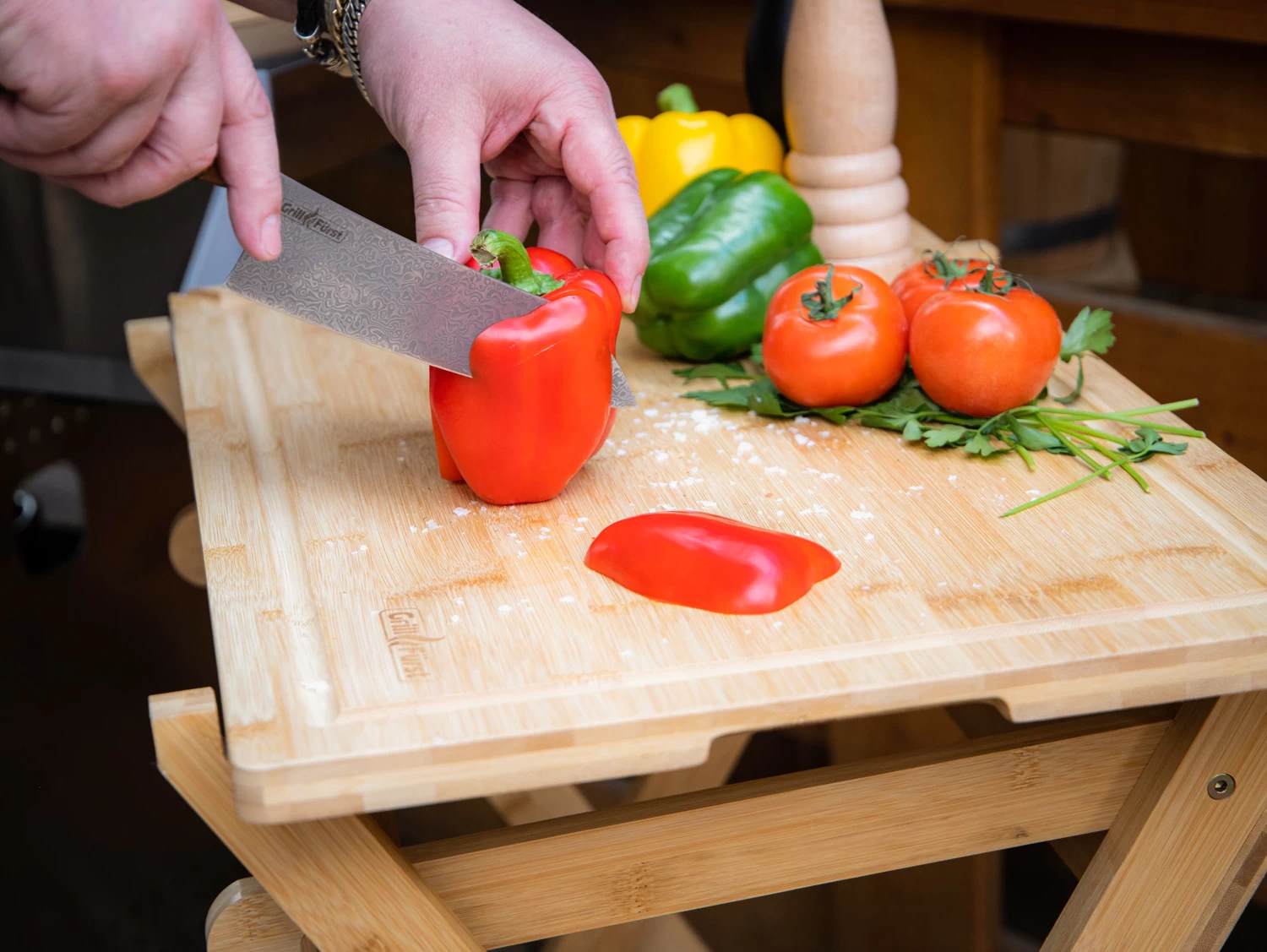 Das Besondere am Grillfürst Holz Klapptisch ist das praktische abnehmbare Schneidebrett aus Bambus. Das hygienische Küchenbrett bietet mit 63 x 40 cm genügend Platz um Gemüse zu schneiden, Fleisch zu würzen oder Vorspeisen anzurichten und ist durch die