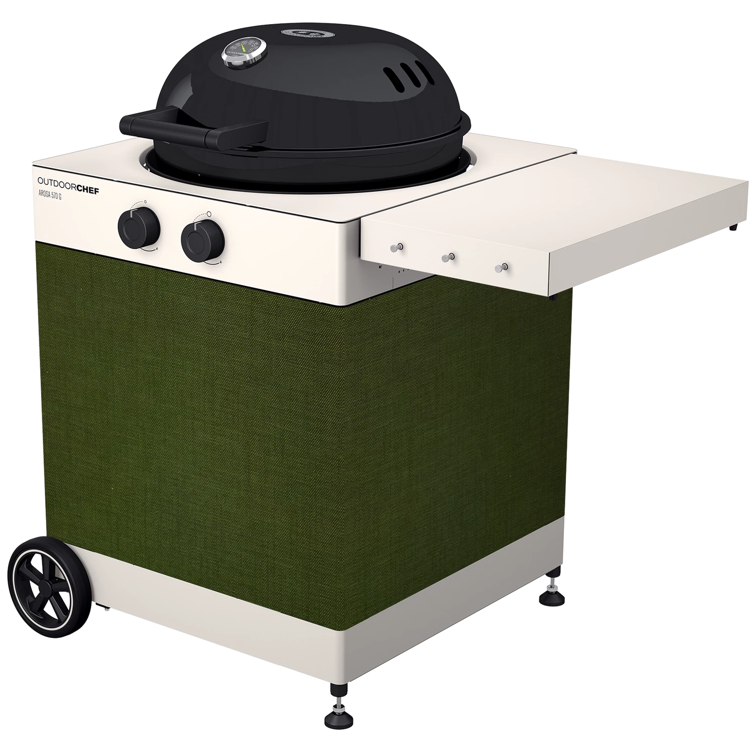 Mit den Textilverkleidungen haben Sie die Möglichkeit, Ihren Outdoorchef Gasgrill ganz individuell zu gestalten – zum Beispiel in einem natürlichen Moosgrün, das perfekt in jeden Garten passt.