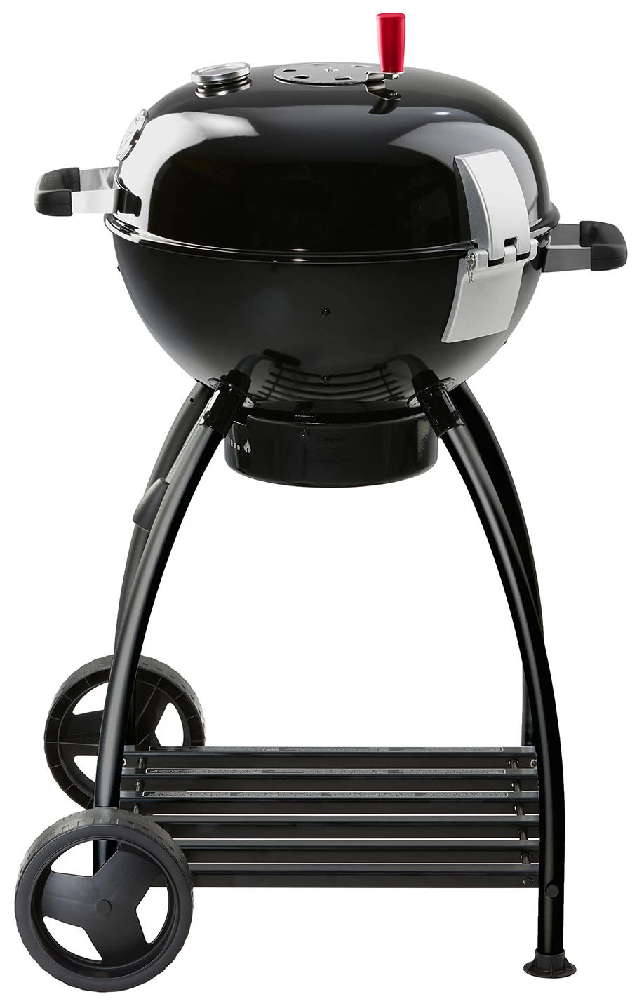 Die Grillkugel sitzt auf einem stabilen Rohrrahmen aus Aluminium und gibt dem Grill einen stabilen Stand. An zwei der Beinen sind Räder montiert, die einen einfachen Transport des Holzkohlegrills versprechen. Zwischen den Beinen des Gestelles ist für die gute Stabilität noch eine Ablage eingebaut. Hier können Sie auch Grillzubehör verstauen.
