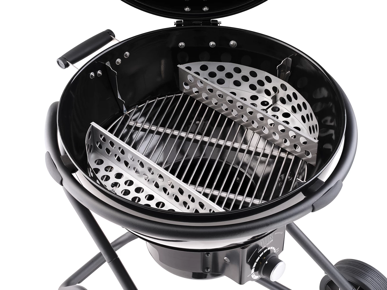 Das AIR Control System lässt sich im wahrsten Sinne des Wortes im Handumdrehen steuern. Hierfür befindet sich unterhalb der Grillkugel auf Höhe des Aschebehälters ein großer Drehknopf, mit dem sich die Menge der Zuluft ganz einfach regulieren lässt. Zusammen mit dem mit dem gut ablesbaren Deckelthermometer können sie die Temperatur im Inneren immer exakt den Bedürfnisse anpassen. Der Drehknopf des AIR Control Systems dient auch gleichzeitig auch als Entriegelung für den Aschebehälter. Dieser lässt sich mit nur einem Dreh ganz einfach entnehmen und reinigen.