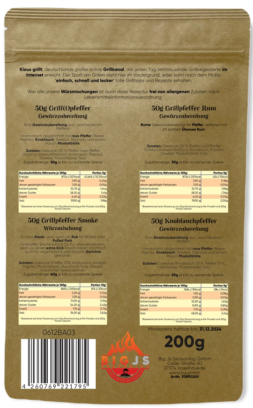 1 x Steak Gewürz Set #1 by Klaus grillt mit Grill(t)pfeffer / Grillpfeffer Rum / Grillpfeffer Smoke / Knoblauchpfeffer je 50g im Beutel