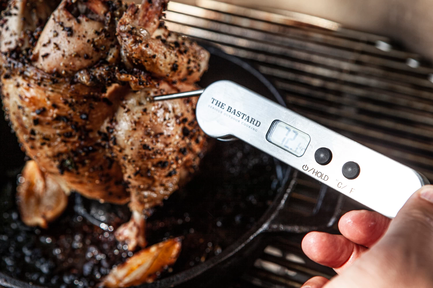 Bestimmen Sie mit dem The Bastard Einstechthermometer in Sekunden die aktuelle Kerntemperatur Ihres Grillguts.
