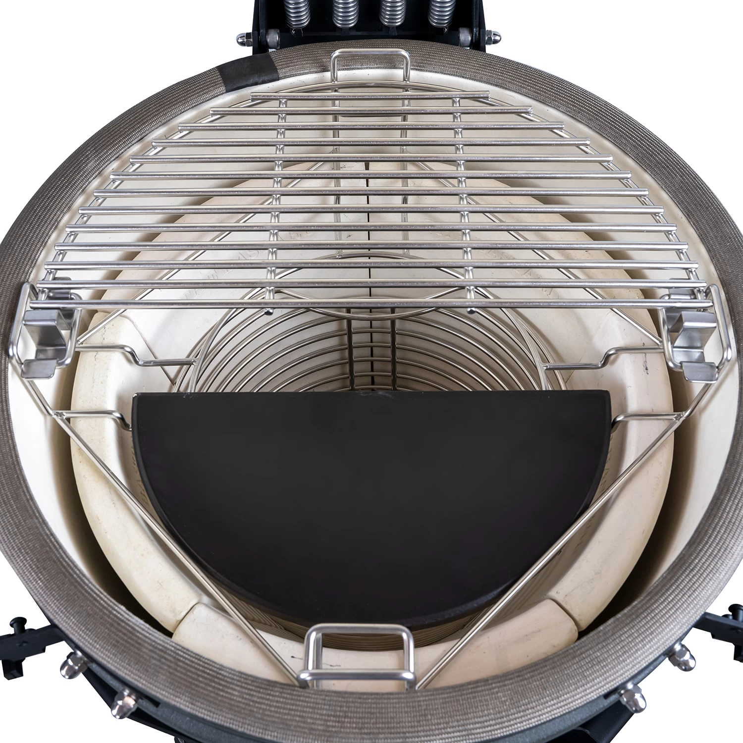 Das Rostsystem besteht aus einem Halter, 2 halben Edelstahlgrillrosten und 2 halben Hitzedeflektoren aus Keramik (Plate Setter). Die geteilten Deflektorsteine ermöglichen das indirekte Grillen auf gesamter oder halber Grillfläche. Durch ihre spezielle Beschichtung sind sie beiden Deflektorsteine besonders pflegeleicht und verschmutzen nicht so leicht.